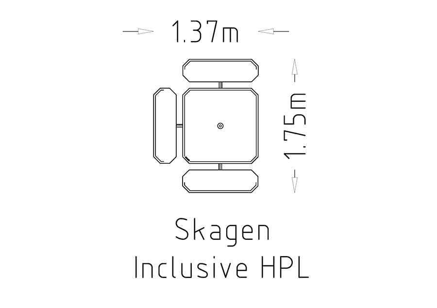 Το τραπέζι πικνίκ Skagen inclusive δημιουργεί ένα φιλόξενο σημείο συνάντησης για άτομα όλων των ηλικιών και ικανοτήτων. Ο σχεδιασμός του προσφέρει άφθονο χώρο για τα πόδια, καθιστώντας το ιδιαίτερα άνετο για ηλικιωμένους και άτομα με περιορισμένη κινητικότητα. Το τραπέζι Skagen περιλαμβάνει έναν κεντρικό χώρο για ομπρέλα που παρέχει σκιά τις ηλιόλουστες μέρες, ενισχύοντας την άνεση για υπαίθριες συγκεντρώσεις. Αυτό το τυπικό μοντέλο χωράει επτά άτομα και φιλοξενεί έναν χρήστη αναπηρικού αμαξιδίου, ενώ διατίθενται επίσης προσαρμοσμένες εκδόσεις με έως και τέσσερις θέσεις για αναπηρικά αμαξίδια κατόπιν αιτήματος.