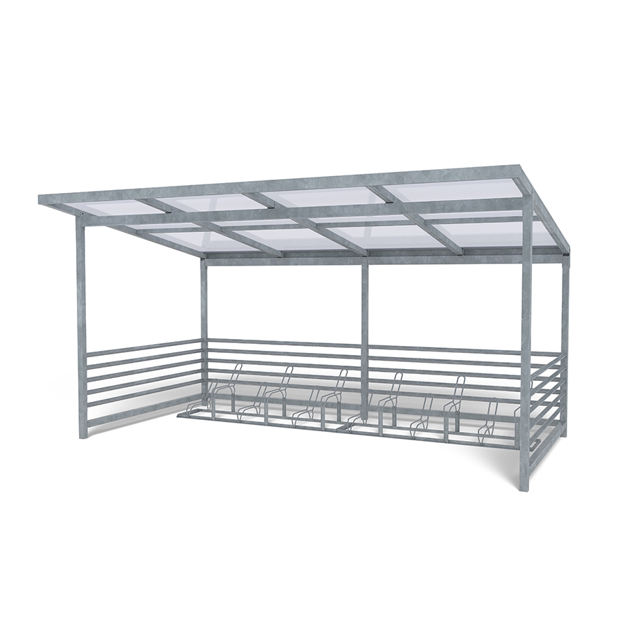 Η στέγη ποδηλάτου Capella με 2 σχάρες ποδηλάτου Gemini είναι μια ανθεκτική λύση χαμηλής συντήρησης για οργανωμένη αποθήκευση ποδηλάτων σε εξωτερικούς χώρους. Σχεδιασμένη με γαλβανισμένες τετράγωνες κολόνες και στιβαρή οροφή, η στέγη Capella είναι ιδανική για σχολεία, πάρκα και κατοικημένες περιοχές. Η στιβαρή της κατασκευή μπορεί να φιλοξενήσει έως και 12 ποδήλατα και μπορεί να επεκταθεί σε διάφορες διαμορφώσεις για να καλύψει μεγαλύτερες ανάγκες. Σε συνδυασμό με δύο ανεξάρτητες, γαλβανισμένες σχάρες ποδηλάτου Gemini - η καθεμία χωράει έξι ποδήλατα - αυτή η διάταξη εξασφαλίζει ευέλικτη και ασφαλή στάθμευση. Εύκολη στην εγκατάσταση και κατασκευασμένη για να αντέχει στα στοιχεία της φύσης, η στέγη Capella προσφέρει μια αξιόπιστη, μακροπρόθεσμη λύση αποθήκευσης για οποιονδήποτε δημόσιο ή ιδιωτικό εξωτερικό χώρο. Αυτή η παραλλαγή διαθέτει ευθεία πλαστική οροφή. Ίσια πλαστική οροφή + 12 PL