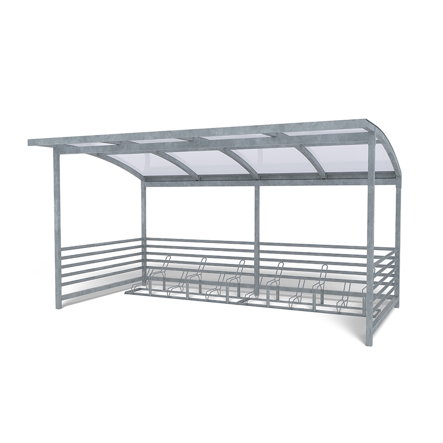 Η στέγη ποδηλάτου Capella με 2 σχάρες ποδηλάτου Gemini είναι μια ανθεκτική λύση χαμηλής συντήρησης για οργανωμένη αποθήκευση ποδηλάτων σε εξωτερικούς χώρους. Σχεδιασμένη με γαλβανισμένες τετράγωνες κολόνες και στιβαρή οροφή, η στέγη Capella είναι ιδανική για σχολεία, πάρκα και κατοικημένες περιοχές. Η στιβαρή της κατασκευή μπορεί να φιλοξενήσει έως και 12 ποδήλατα και μπορεί να επεκταθεί σε διάφορες διαμορφώσεις για να καλύψει μεγαλύτερες ανάγκες. Σε συνδυασμό με δύο ανεξάρτητες, γαλβανισμένες σχάρες ποδηλάτου Gemini - η καθεμία χωράει έξι ποδήλατα - αυτή η διάταξη εξασφαλίζει ευέλικτη και ασφαλή στάθμευση. Εύκολη στην εγκατάσταση και κατασκευασμένη για να αντέχει στα στοιχεία της φύσης, η στέγη Capella προσφέρει μια αξιόπιστη, μακροπρόθεσμη λύση αποθήκευσης για οποιονδήποτε δημόσιο ή ιδιωτικό εξωτερικό χώρο. Αυτή η παραλλαγή διαθέτει θολωτή πλαστική οροφή.