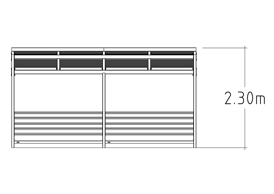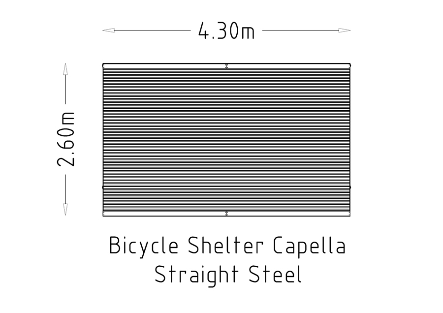 Το στέγαστρο ποδηλάτων Capella είναι ένα στιβαρό στέγαστρο ποδηλάτων κατάλληλο για σχολικούς χώρους, πάρκα και κατοικημένες περιοχές. Με τις γαλβανισμένες τετράγωνες κολόνες και την στιβαρή κατασκευή της οροφής, ουσιαστικά δεν χρειάζεται συντήρηση. Το γκαράζ ποδηλάτων μπορεί να φιλοξενήσει έως και δώδεκα ποδήλατα, αλλά μπορεί επίσης να επεκταθεί σε διάφορες διαμορφώσεις. Συνιστούμε την προσθήκη 2 βάσεων ποδηλάτων Gemini (8003537) για να χωρέσουν 12 ποδήλατα. Μπορεί επίσης να χρησιμοποιηθεί ως στέγαστρο για καρότσια ή ως σταθμός διαλογής απορριμμάτων. Αυτή η παραλλαγή διαθέτει ίσια οροφή από κασσίτερο.