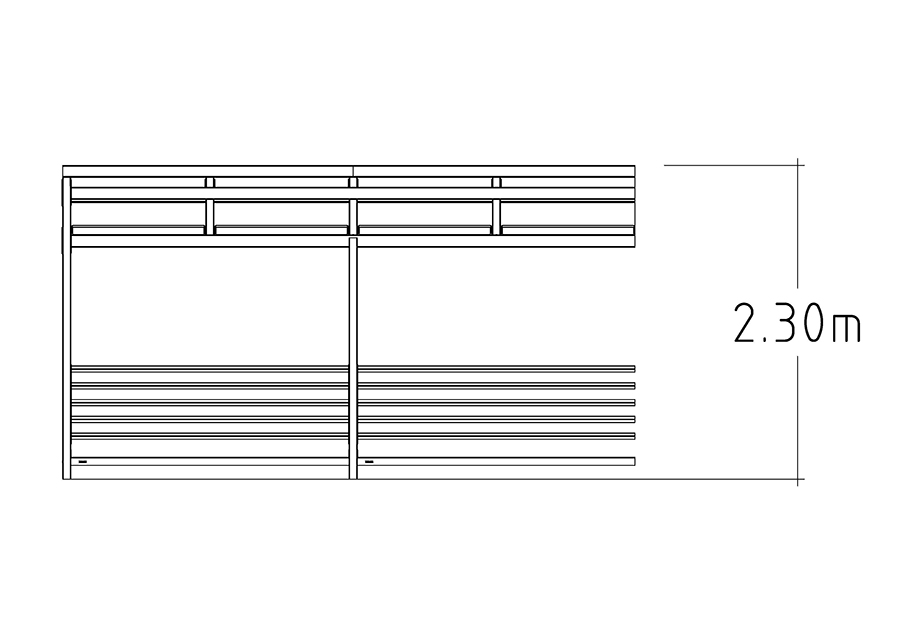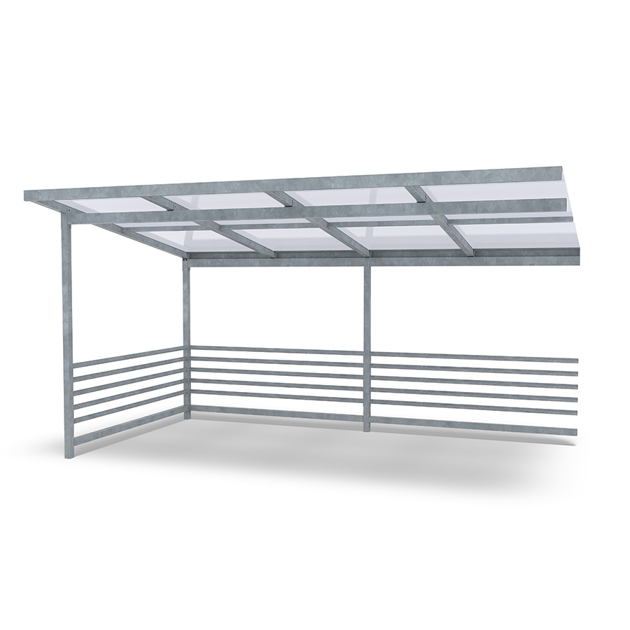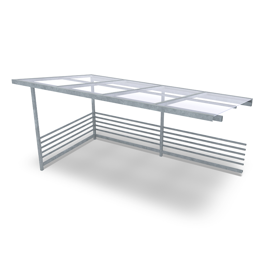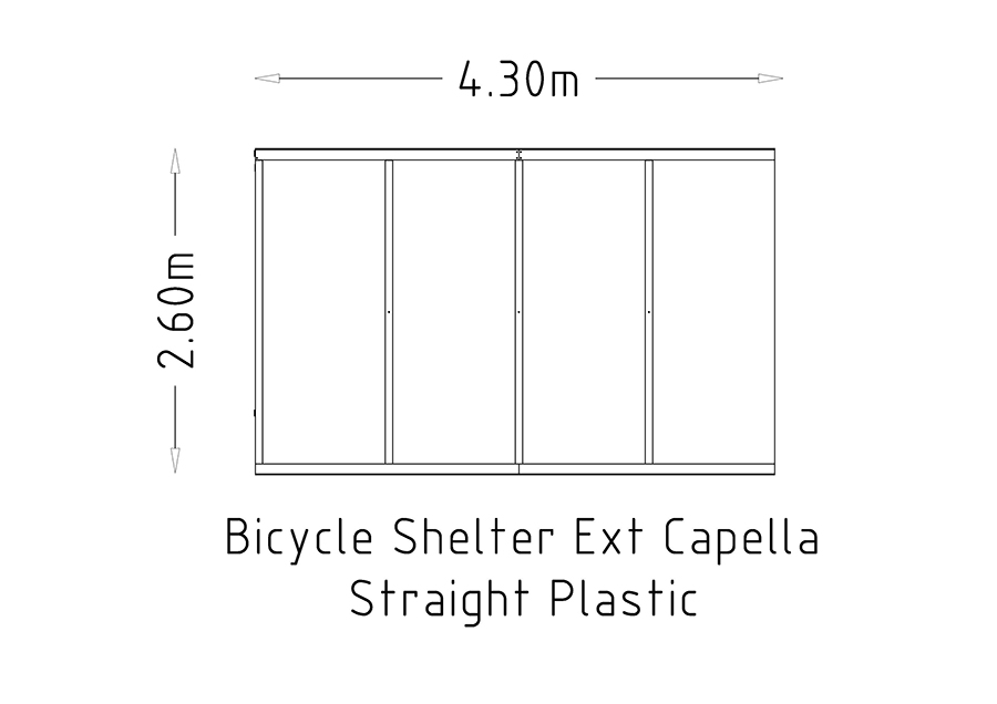 Επεκτείνετε το στέγαστρο ποδηλάτων Capella για να δημιουργήσετε χώρο για ακόμη περισσότερα ποδήλατα ή χρησιμοποιήστε τον χώρο ως στέγαστρο για καρότσια ή ως σταθμό διαλογής απορριμμάτων. Αυτή η παραλλαγή διαθέτει ίσια πλαστική οροφή.