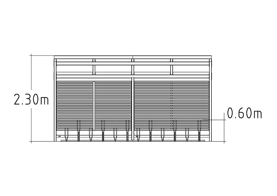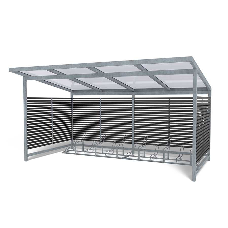 Η στέγη ποδηλάτων Stella με 2 σχάρες ποδηλάτων Gemini προσφέρει μια κομψή, ανθεκτική λύση για εξωτερική αποθήκευση ποδηλάτων. Σχεδιασμένη με μαύρες ξύλινες σανίδες Nordic Pine —με δυνατότητα προσαρμογής σε οποιοδήποτε χρώμα— συμπληρώνει τόσο την κλασική όσο και τη μοντέρνα αρχιτεκτονική. Η στέγη διαθέτει επιλογή από ευθείες ή θολωτές στέγες από κυματοειδές κασσίτερο ή πλαστικό και χωράει έως και 12 ποδήλατα. Σε συνδυασμό με δύο ανεξάρτητες, γαλβανισμένες σχάρες Gemini (η καθεμία χωράει έξι ποδήλατα), αυτή η διάταξη παρέχει ευέλικτο και ασφαλές παρκινγκ. Εύκολη στην εγκατάσταση και επέκταση με κιτ επέκτασης, είναι ιδανική για σχολεία, επιχειρήσεις και δημόσιους χώρους που αναζητούν μια κομψή, ανθεκτική στις καιρικές συνθήκες και αποδοτική λύση αποθήκευσης ποδηλάτων. Αυτή η παραλλαγή διαθέτει ευθεία πλαστική στέγη. Οι πόρτες με κλειδί είναι προαιρετικές, καθιστώντας τη Stella ιδανική όχι μόνο για αποθήκευση ποδηλάτων, αλλά και ως πάρκο για καροτσάκια ή σταθμό διαλογής απορριμμάτων.