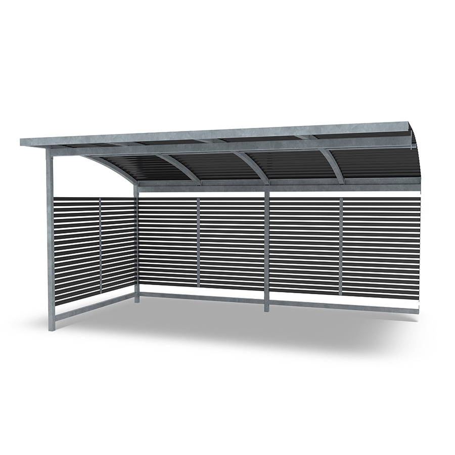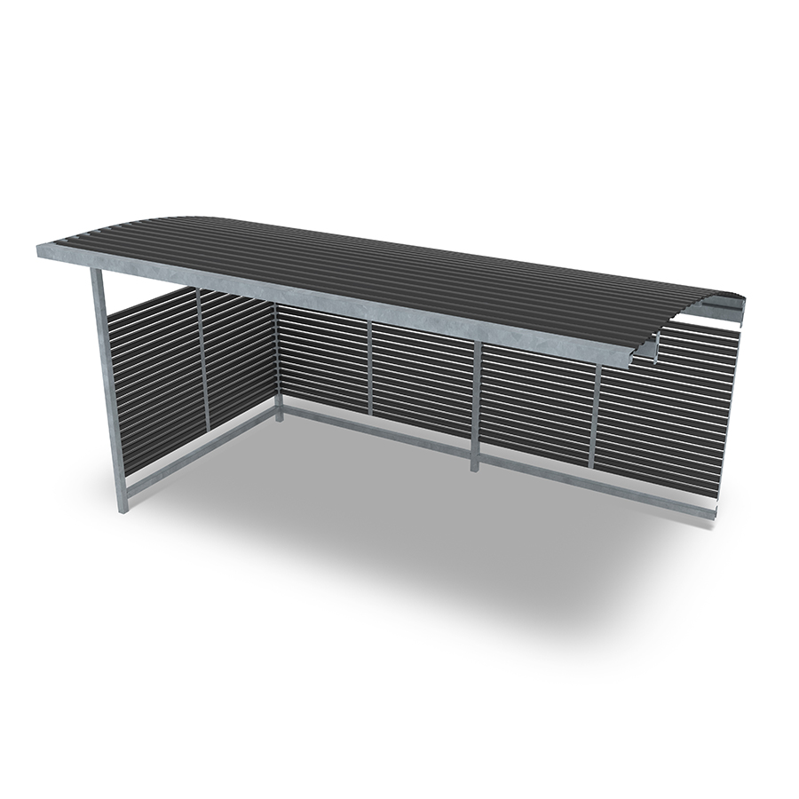 Επεκτείνετε το στέγαστρο ποδηλάτων Stella για να δημιουργήσετε χώρο για ακόμη περισσότερα ποδήλατα ή χρησιμοποιήστε τον χώρο ως στέγαστρο για καρότσια ή ως σταθμό διαλογής απορριμμάτων. Αυτή η παραλλαγή διαθέτει καμπυλωτή οροφή από κασσίτερο.